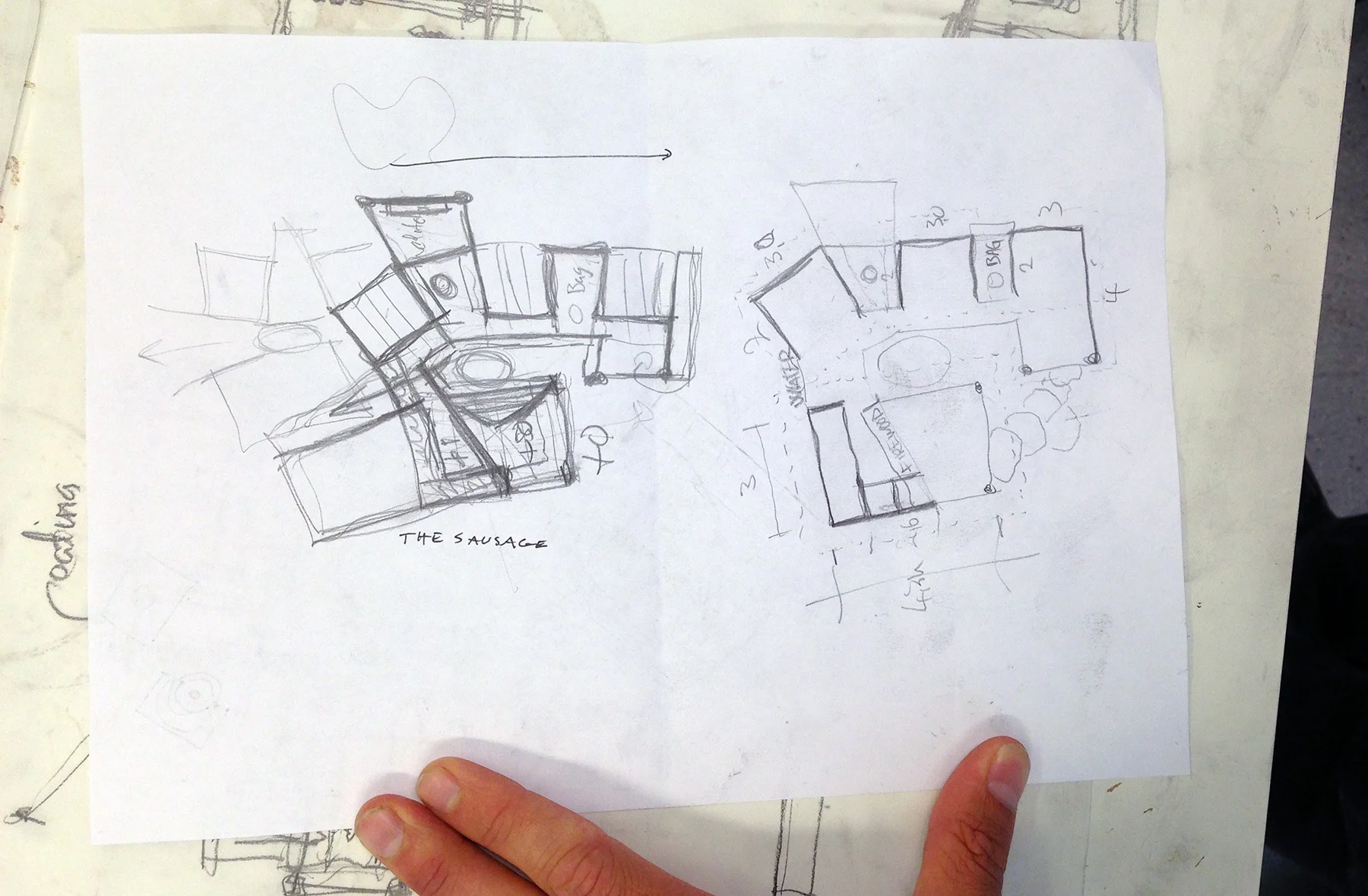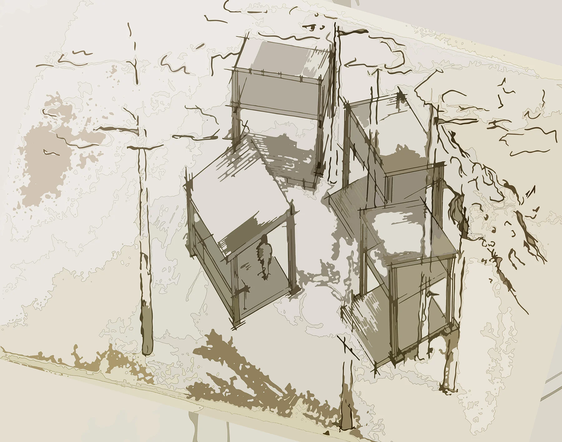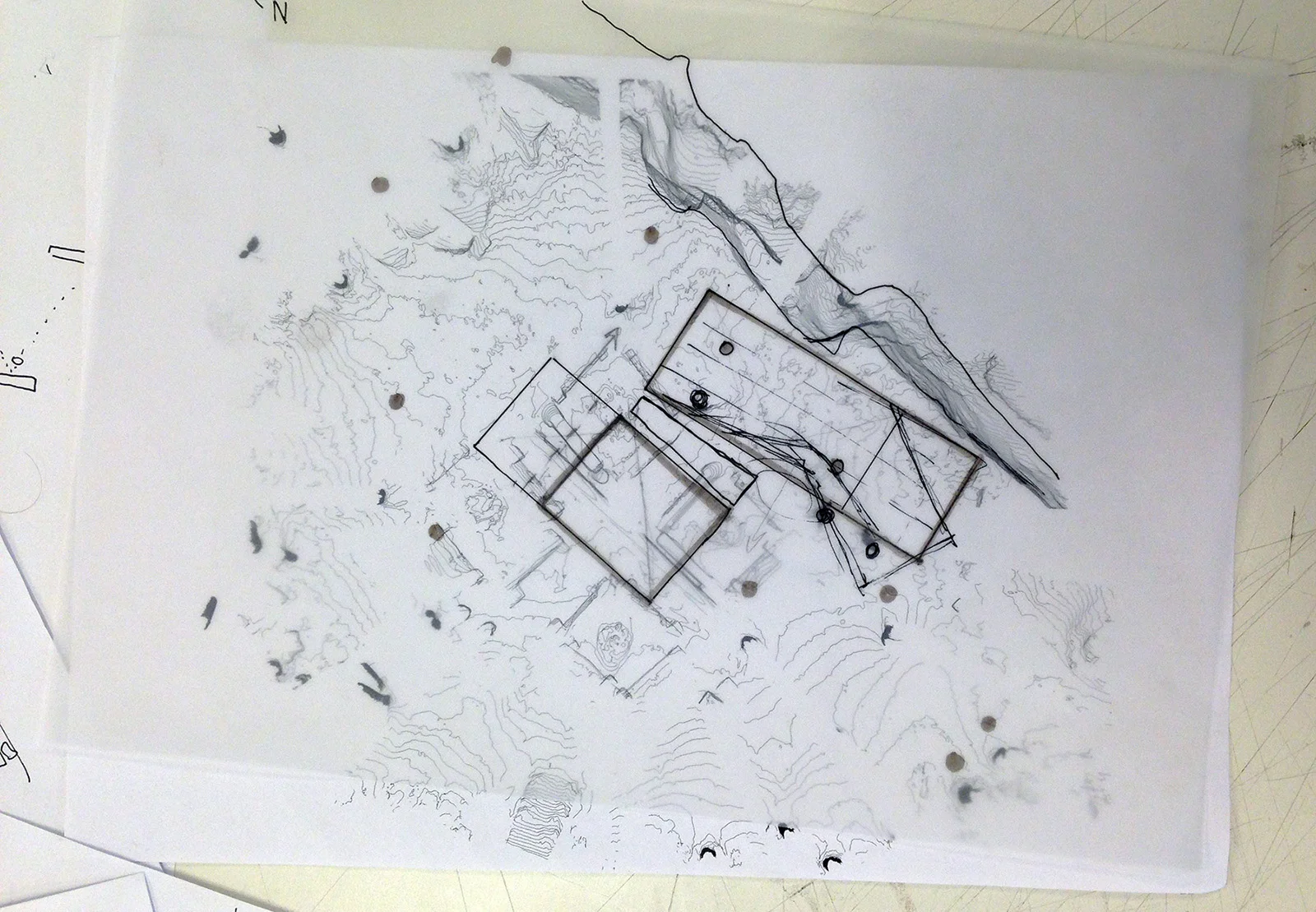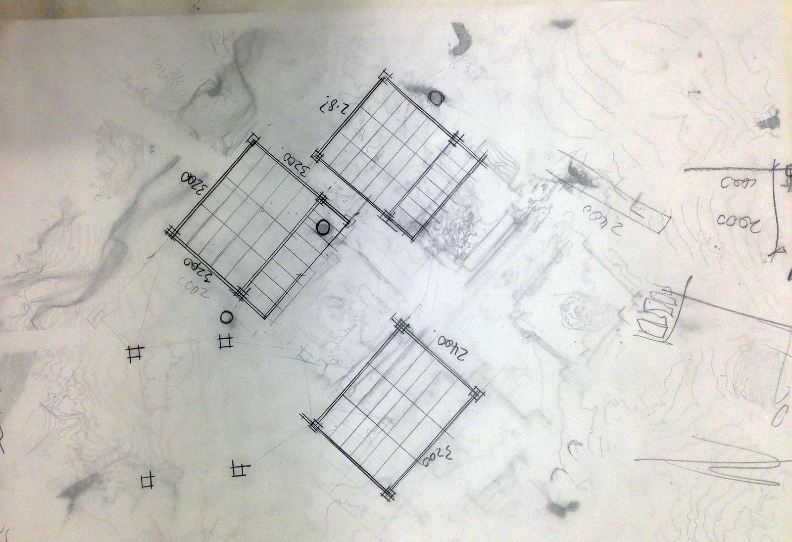 The last few days of the week the groups divided in a sense to one working on the grasshopper script and another working on design. The design ended up in a cluster like form with sleeping units along a rock wall and a more open central kitchen structure. The floor of the sleeping units were to be around 2000mm from ground level with a low roof overhead. A platform underneath these would permit storage and further sleeping areas if required. The fire place ground level platforms around the units were pushed and pulled to create external spaces and to fit around existing trees. Some drawings below.