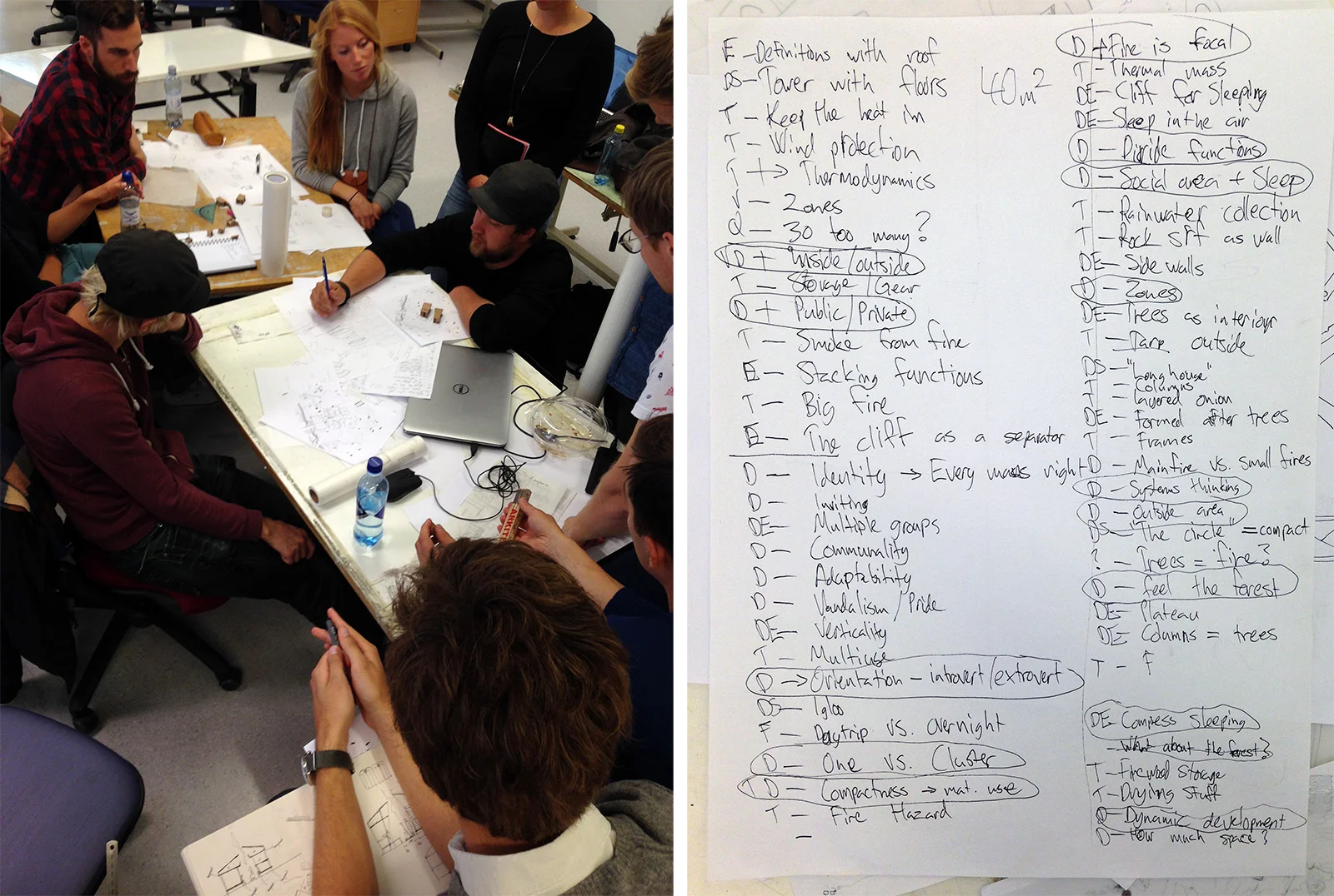 We spent the week moving between different forms of work, individual and group, sketch design to grasshopper, and by the end of the week we had settled into areas of which maybe we felt a little more comfortable. But we all began the week together with some individual sketching, various analysis techniques and ideas about the project. Through this we came up with some key terms that were popping up between out ideas, as shown below and Pasi assisted in refining these down to common conceptual ideas. This generally was based around structures where sleeping was happening in a second level with more ambiguous storage / resting / sleeping platform underneath. In terms of the project's layout on site, by the second day this form was being explored in four ways, as a circular plan, two masses facing one another, an individual mass and a cluster arrangement. All of these were to be potentially focussed around a fire with discussions of community, privacy, add ons etc.